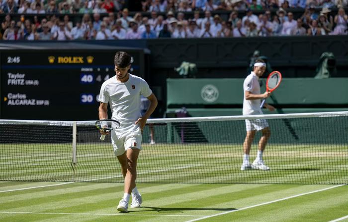 阿尔卡拉斯对阵弗里茨的这场比赛,被很多网友视为“最没有悬念的一场男单半决赛”。网友之所以这么说,很大一部分原因是阿尔卡拉斯的表现太强了,场均83%的一发得分率和67%的网前得分率让他傲视群雄,而且目前他在温网的连胜已经达到了19胜,而单打连胜纪录更是已经达到了23连胜。