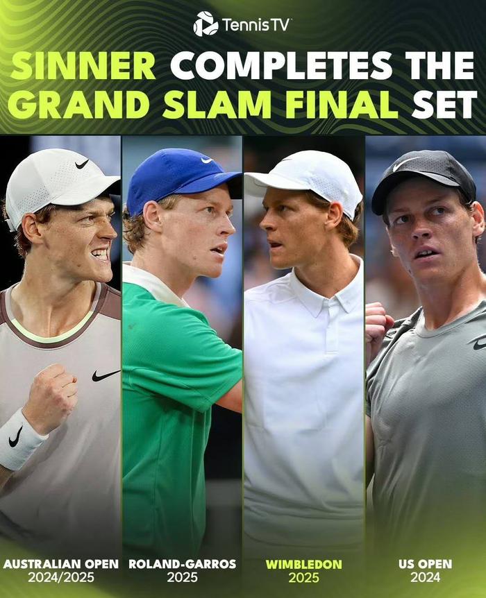 值得一提的是,在闯入温网决赛后,23岁的辛纳成为公开赛时代进入全部四项大满贯赛事决赛的第二年轻的男子选手,仅次于考瑞尔。更令人感到惊艳的是,辛纳第一次打进大满贯决赛是2024年澳网,仅仅隔了6个大满贯赛后,他就在2025年温网解锁了四大满贯都打进决赛的壮举,创造新纪录。