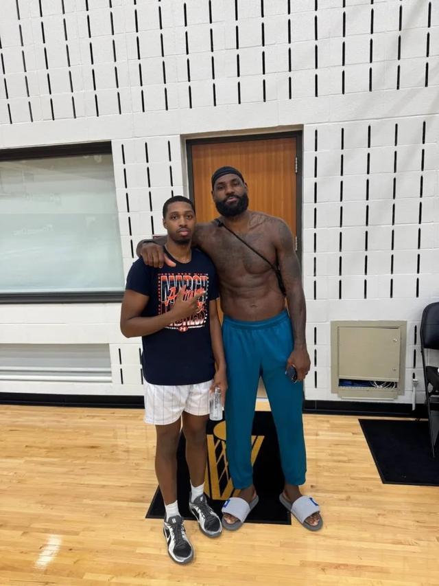 从照片上可以看到两人合影的地板上有骑士队的新款队徽logo,整体环境看起来就是骑士训练馆无疑了。