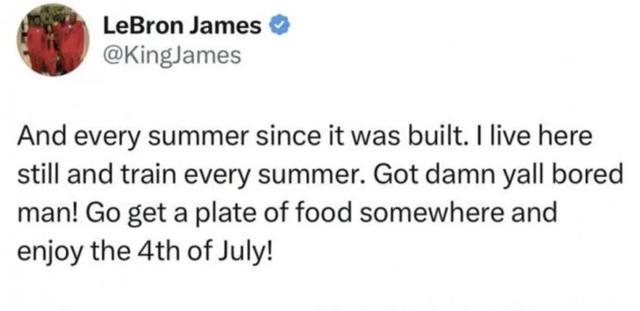 詹姆斯说:“自它(骑士训练馆)建成以来,我每年夏天都会去哪里训练。我仍然居住在这里,每年夏天都会来训练。你们这些人真无聊!去找点吃的吧!”