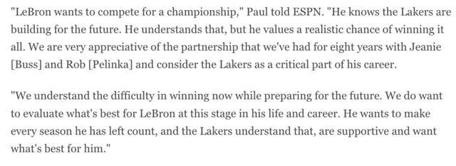 在这个敏感的时间点,詹姆斯的经纪人里奇-保罗还接受了ESPN的采访,发表了一段比较耐人寻味的言论。