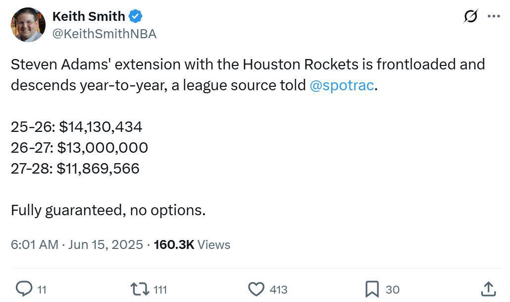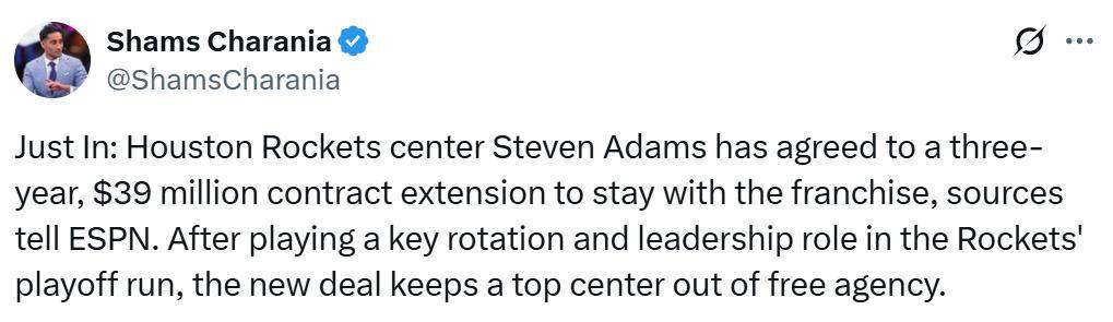 根据ESPN名记Shams报道,火箭队已经与球队内线亚当斯完成提前续约,双方达成了一份3年价值3900万美元的新约。