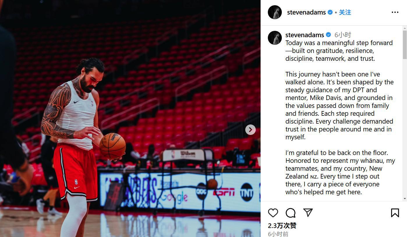 亚当斯本人也十分开心,在社媒发文感谢了火箭队、队医、治疗师和球迷。