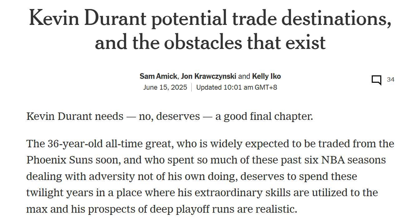 根据Shams报道,杜兰特最终选择已经圈定到火箭、马刺和热火三支球队,他希望加盟这三支球队,愿意长期为他们出战。