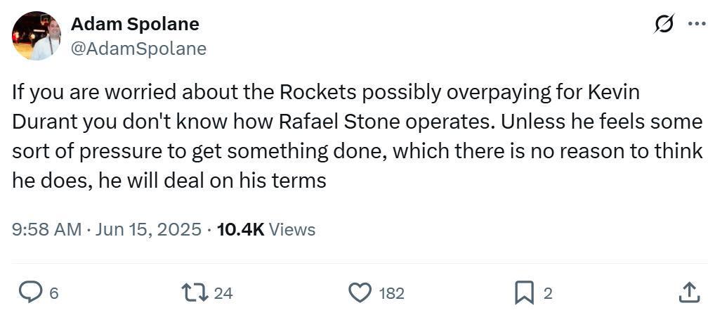 火箭记者Adam Spolane也给出明确表态,直言球迷们不必太担心火箭会花大价钱引进杜兰特。